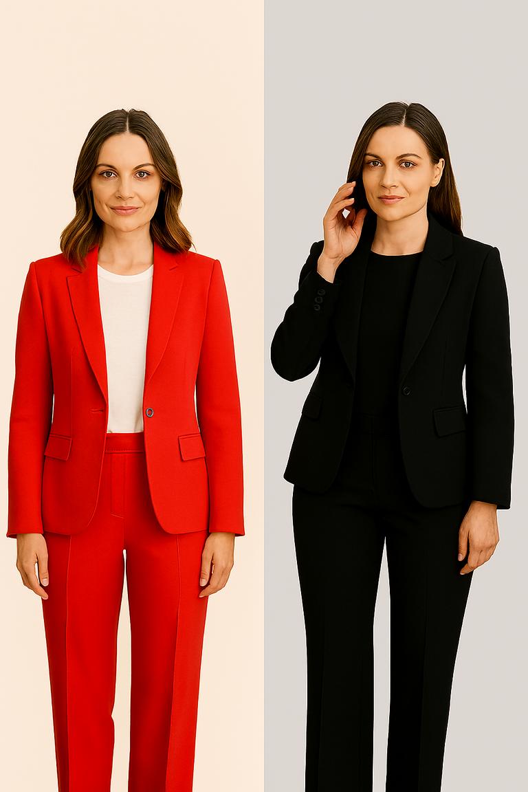Rot und schwarz sind zwei der stärksten Farben in der Businessgarderobe – sie sprechen nonverbal eine klare Sprache und können je nach Einsatz empowernd oder auch herausfordernd wirken. Rot signalisiert Energie, Leidenschaft und Durchsetzungsstärke. Wer Rot trägt, zieht automatisch Aufmerksamkeit auf sich und vermittelt Dynamik sowie Motivation. Gleichzeitig kann die Farbe aber auch als aggressiv oder provokant wahrgenommen werden, wenn sie zu dominant eingesetzt wird. In sensiblen Gesprächssituationen wirkt Rot manchmal einschüchternd und sollte daher eher als Akzentfarbe genutzt werden – etwa durch einen Blazer, ein Accessoire oder Lippenstift, um Power zu zeigen, ohne zu überfordern.